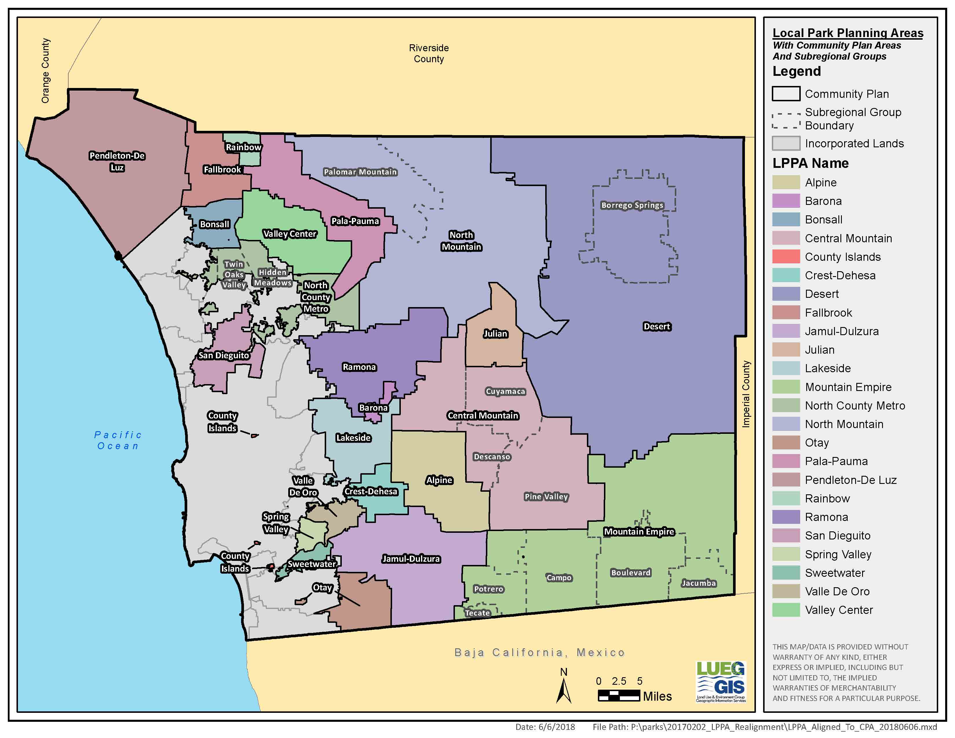 Community Planning and Sponsor Groups advise and assist in recommending priorities, site selection and development of park facilities within their community. The PLDO divides the County into 24 Local Park Planning Areas (LPPAs) that coincide with the Community and Subregional Plan boundaries. View the LPPA map or use the PDS – Zoning & Property Information Tool in the County of San Diego Public Web Map Gallery to identify the applicable Local Park Planning Area and community. Park impact fees collected pursuant to the PLDO are to be used benefit the LPPA where the project is located.